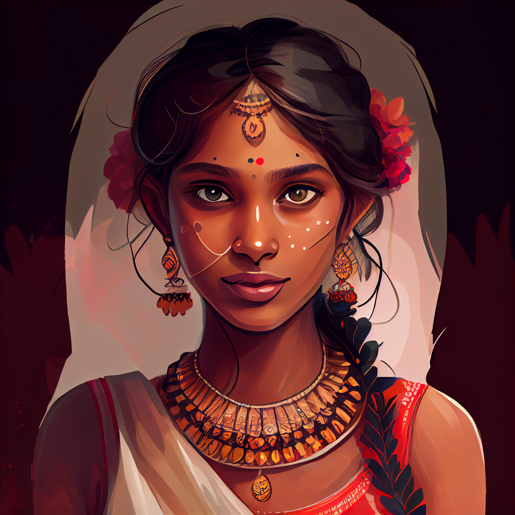 This digital image features a stunning dark-skinned Indian girl with beautiful features. Her deep brown complexion is highlighted by the golden hues of her traditional Indian jewelry and clothing. Her dark eyes are captivating and draw the viewer in, while her confident expression exudes strength and beauty. This image would be perfect for use in a variety of digital projects, including social media graphics, blog posts, and website banners. Download it now to add a touch of cultural richness and diversity to your design work.